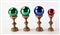 Quattro wish balls diverse in vetro soffiato, Inghilterra, fine XIX/inizi XX secolo due verdi ed una blu di analoga misura ed una rossa più piccina; piedistalli in legno tornito altezza cm 19 e cm 16,5