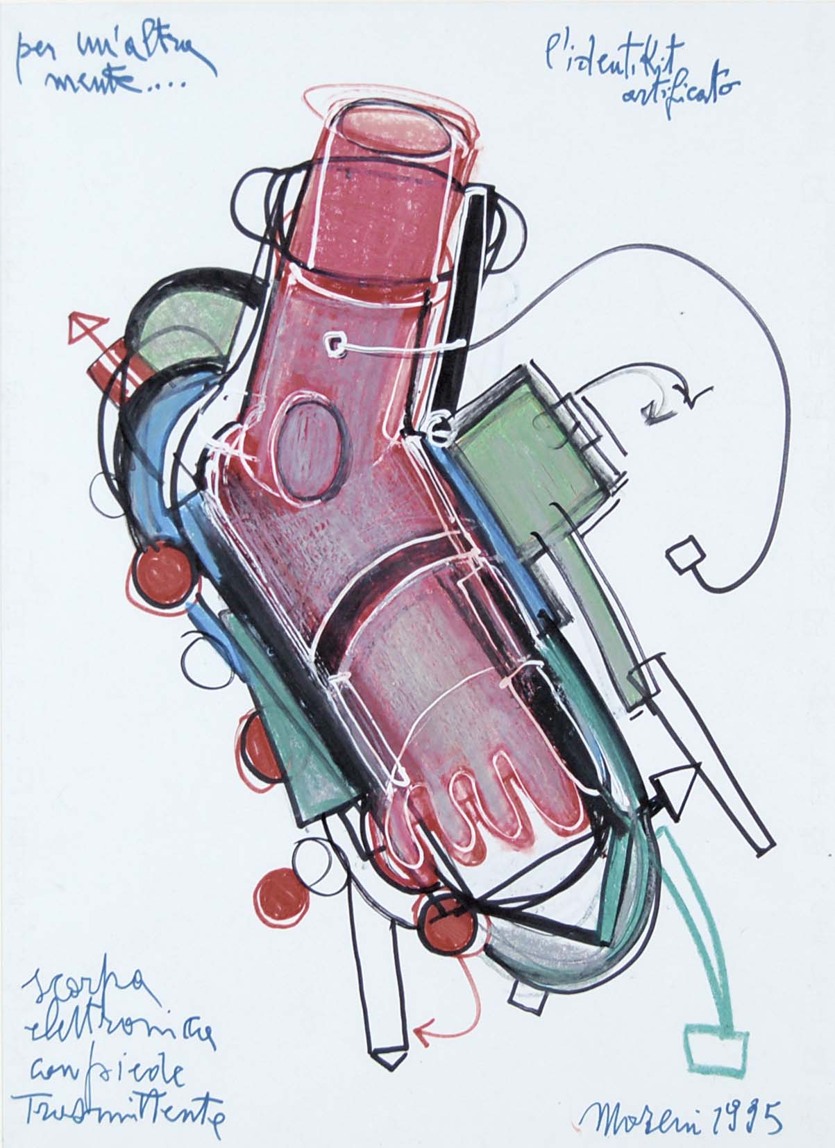 MORENI MATTIA Pavia 1920 - 1999 Scarpa elettronica con piede trasmittente 1995 tecnica mista su carta 66x48 cm firma e data in basso a destra titolo in basso a sinistra autentica dell'Autore su foto