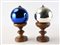 Due wish balls in vetro soffiato blu e argento, Inghilterra, fine XIX/inizi XX secolo piedistalli in legno tornito altezza cm 22