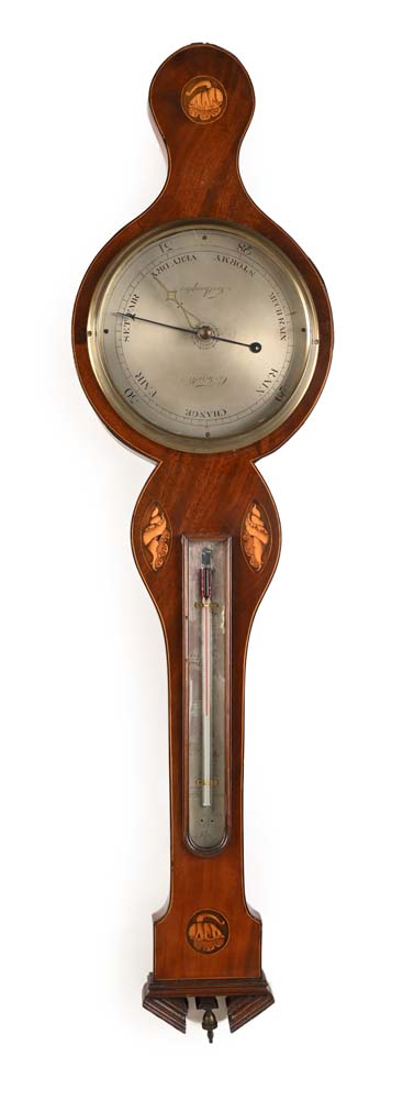 Barometro a banjo in mogano con intarsi in legno di frutto, Inghilterra, XIX...