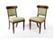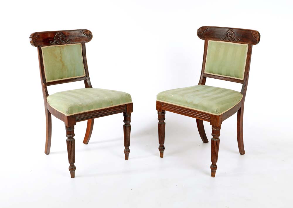 Coppia di sedie in mogano, Inghilterra, seconda metà del XIX secolo spalliera decorata da rilievi vegetali in forma di palmetta centrale ed esili racemi laterali; sedili imbottiti rivestiti in tessuto verde, gambe anteriori con attacchi torniti, percorse da nervature; posteriori a sciabola cm 87x48x43 Famiglia Imperiali, Roma, discendenti di Paolo Camillo Thaon di Revel e di Sant'Andrea, Duca del Mare, Torino