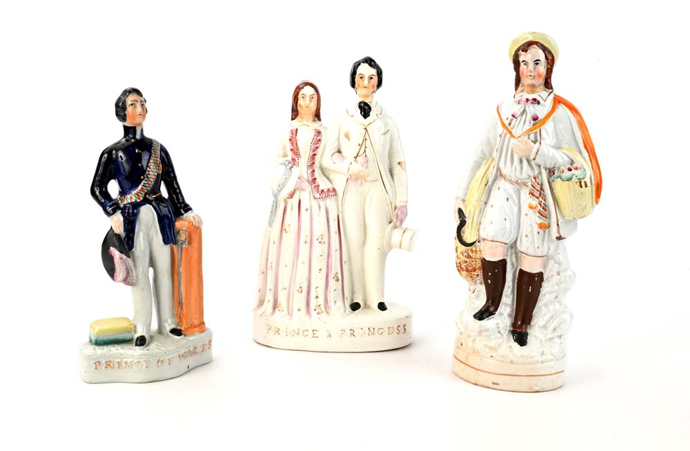 Tre grandi figure in ceramica policroma, Inghilterra, Staffordshire, XIX e XX secolo ritratto del principe di Galles in piedi con la mano sinistra posata su piedistallo e la destra che regge un cappello piumato (altezza cm 27); grande gruppo raffigurante re Edoardo VII (1841 - 1910) e la regina Alexandra (1844 - 1925) ritratti in abiti civili (cm 30x17,5x9) ed una figura di villano con fascina e falcetto nella mano sinistra ed una cesta nella mano destra (altezza cm 33,5). Marca assente misure diverse