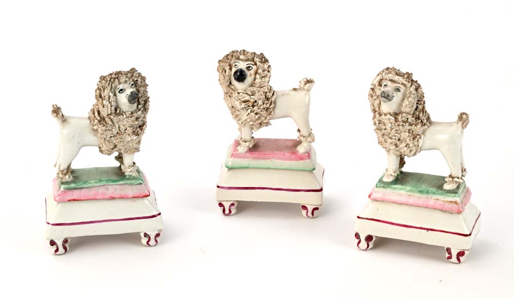 Tre figure di cane barboncino su base, Inghilterra, Staffordshire, XIX secolo cm 10x6,5x4