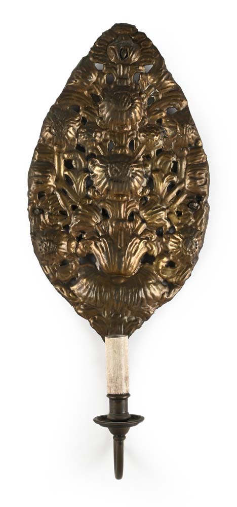 Tre palme in metallo sbalzato e dorato, XVIII/XIX secolo una coppia ed una terza di dimensioni maggiori di sagoma cuspidata in forma di bouquet fiorito; alla base un braccio reggicandela arcuato con ventola paraluce cm 75x33x20 e cm 50x21x17 (la coppia)