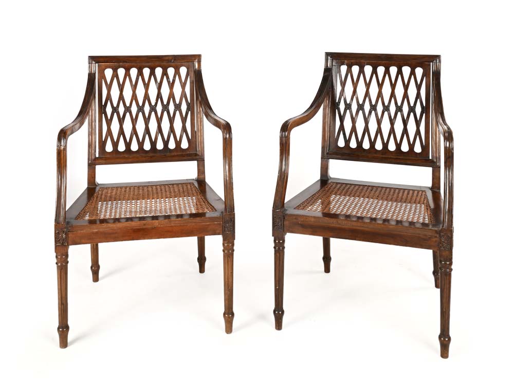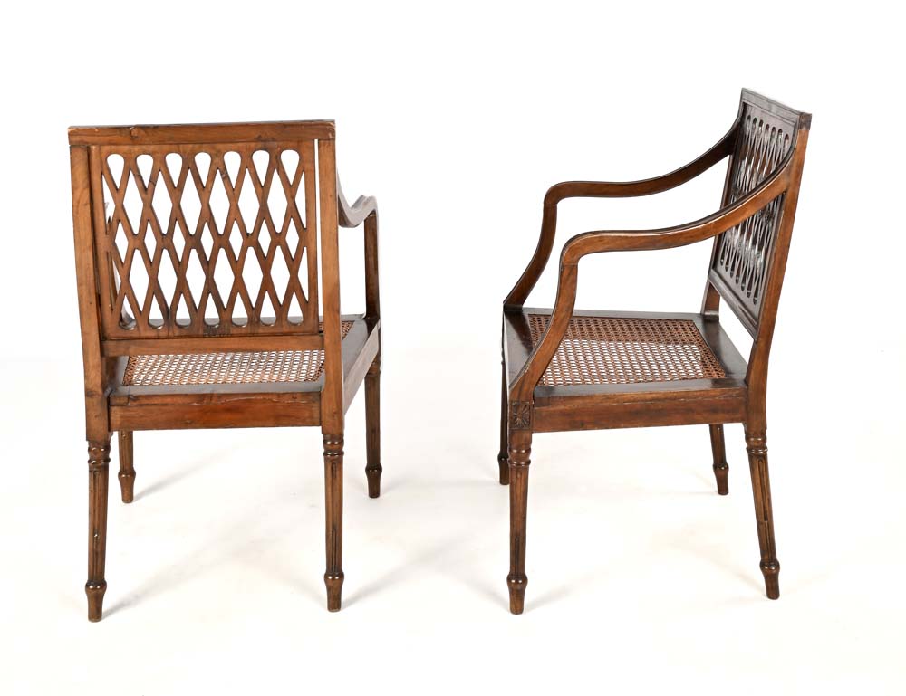 Coppia di poltrone in noce, Veneto, XVIII secolo schienale a giorno con motivi di losanghe, sedile imbottito, gambe rastremate cm 87x57x47