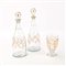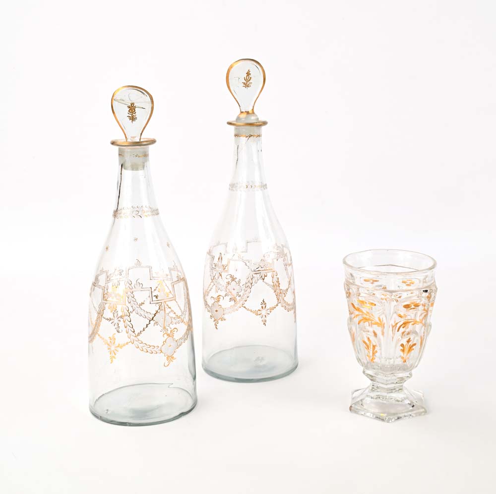 Coppia di bottiglie in vetro soffiato con tappo e decoro in oro dato a freddo, XIX secolo Unite ad un bicchiere a calice in vetro di forma esagonale con decorazione dipinta in oro a motivi vegetali altezza cm 30 e cm 13,5