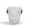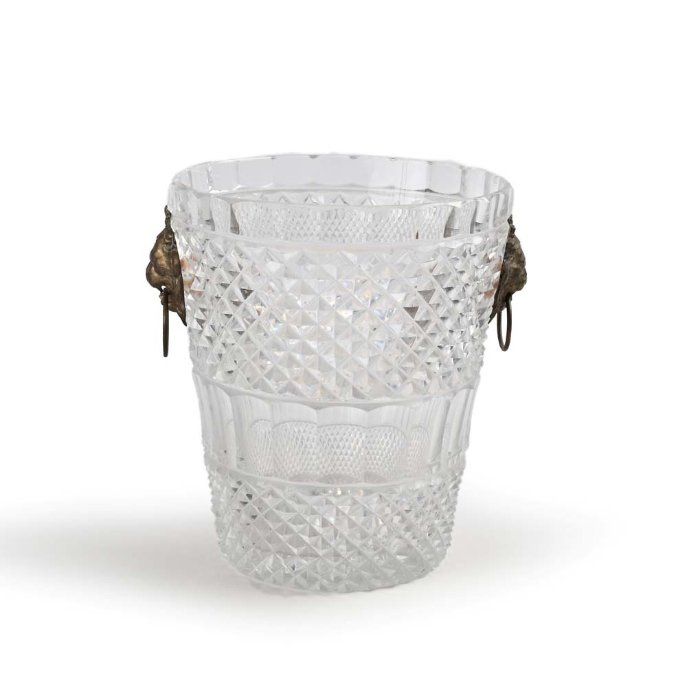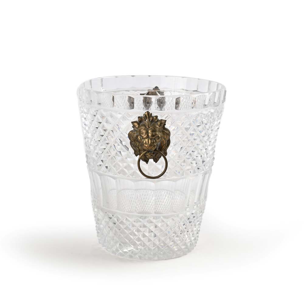 Rinfresca bottiglia in cristallo intagliato, inizi XX secolo caratterizzato da anse ad anello trattenuto da protome leonina in metallo dorato