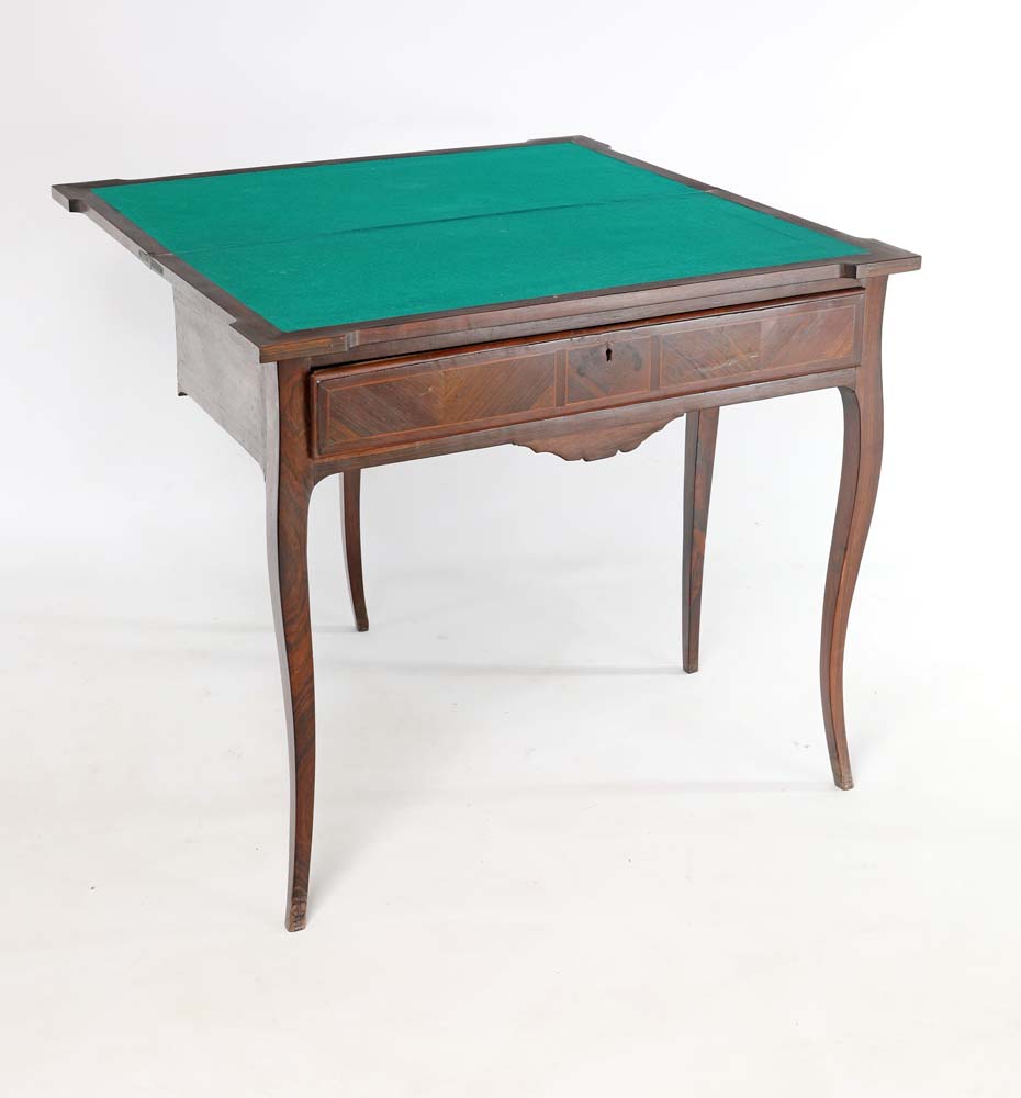 Tavolino da gioco in palissandro e altri legni, Italia settentrionale, XVIII secolo con piano a libretto, gambe mosse cm 76x86x43,5