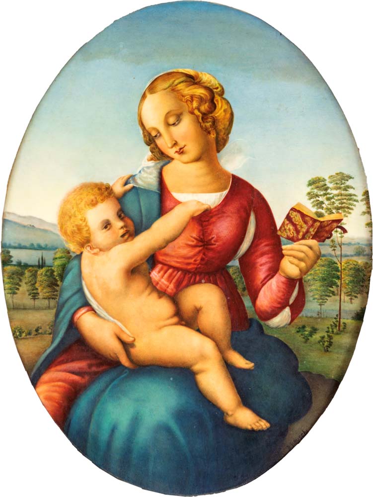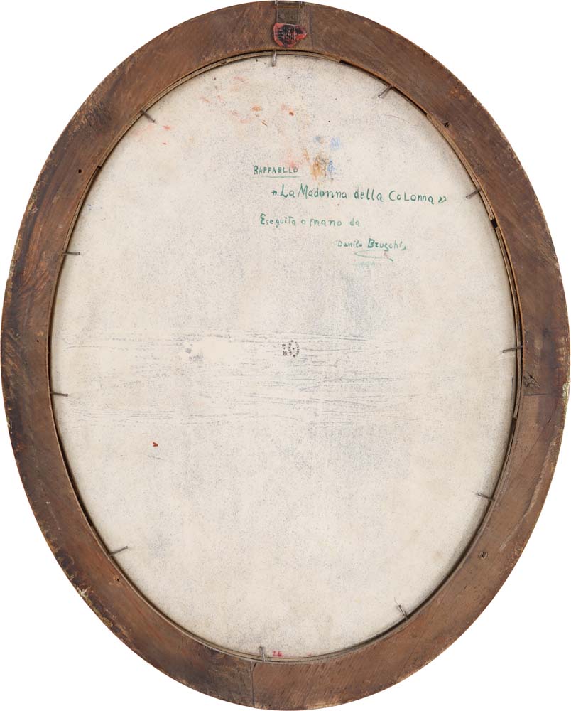 Madonna Colonna - da Raffaello Sanzio Firmata in basso a destra: D. Bruschi. Al verso, al centro, timbro Richard Ginori 5 - 38; in alto iscrizione manoscritta: Raffaello, "Madonna della Colonna" eseguita a mano da Danilo Bruschi placca ovale in porcellana dipinta a mano cm 38x29 - in cornice cm 44,5x36