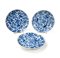 Tre piatti in porcellana bianca e blu con fitta decorazione floreale, Cina, XVIII secolo