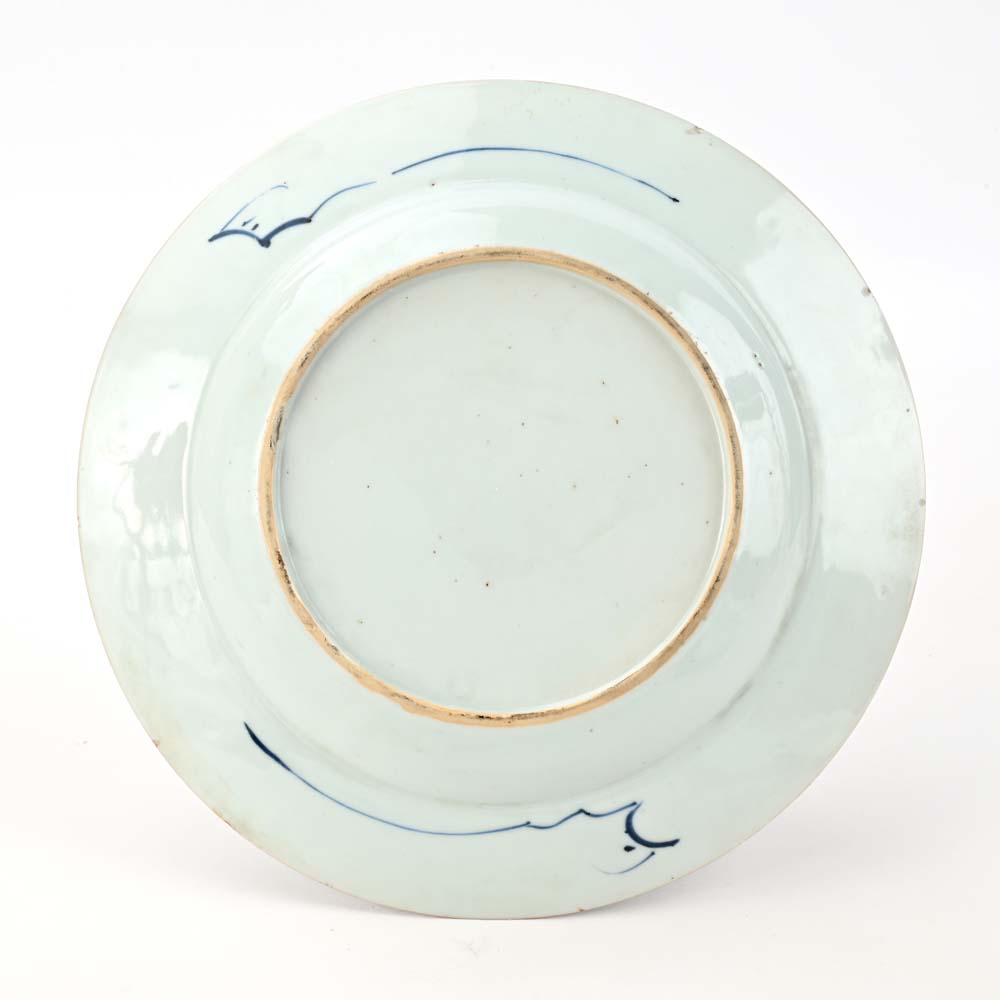 Quattro piatti in porcellana bianca e blu, Cina, XVIII secolo con fitta decorazione floreale al centro racchiusa da ghirlanda e composizioni fiorite lungo la tesa diametro cm 23