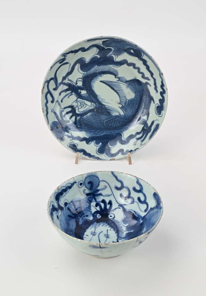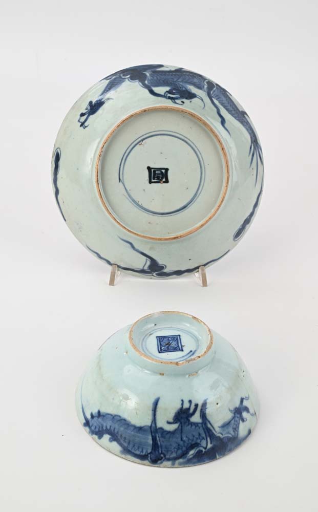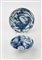 Due ciotole diverse in porcellana bianca e blu, Cina, XVIII secolo decorate con figure di drago cm 4,5x20 e cm 6,5x14,5