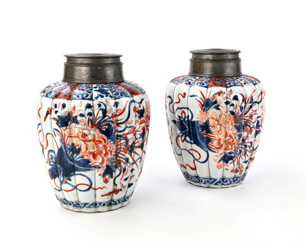 Coppia di ginger jars in porcellana Imari con chiusura in peltro, Cina, XVIII secolo caratteristica forma a giara percorsa da nervature con elegante decorazione in rosso, blu e oro a motivi naturalistici altezza cm 25,5