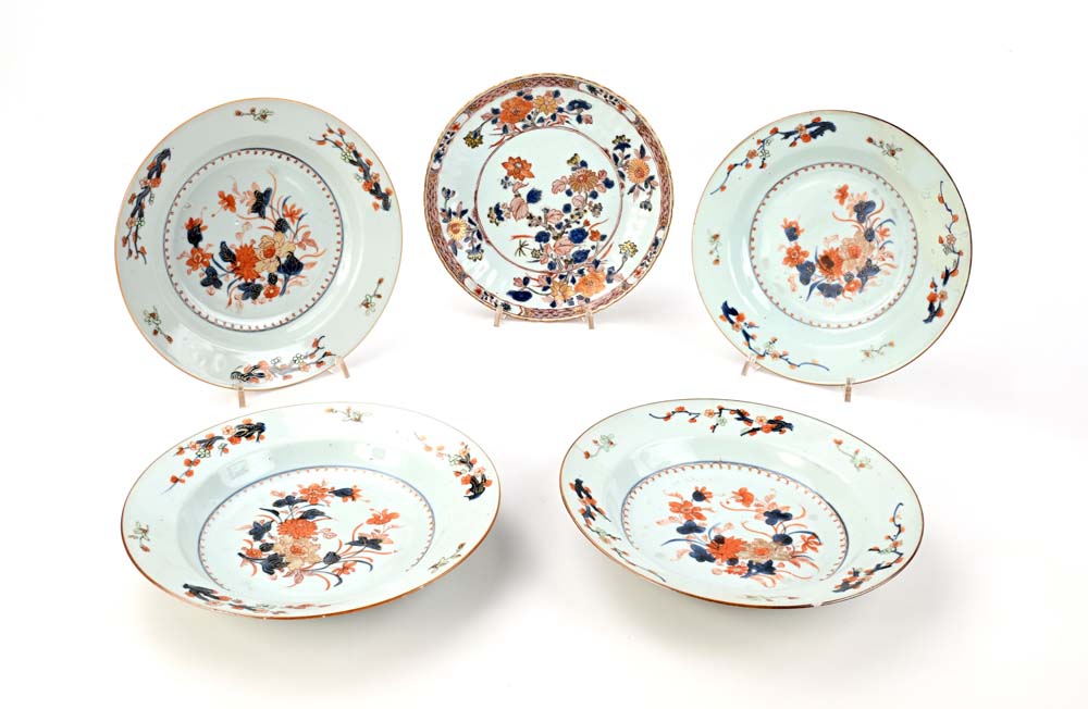 Cinque piatti diversi in porcellana Imari, XVIII secolo quattro uguali ed uno dalle simili caratteristiche decorative diametro cm 23 (quattro) e cm 22,5