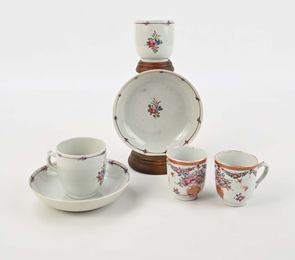 Quattro tazzine in porcellana policroma di cui due senza piattino, Compagnia delle Indie