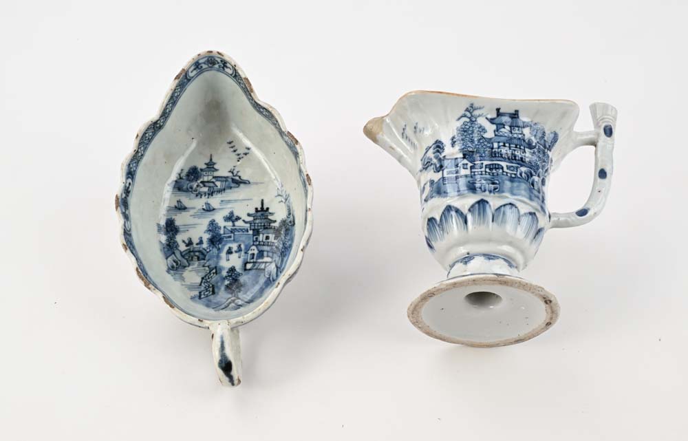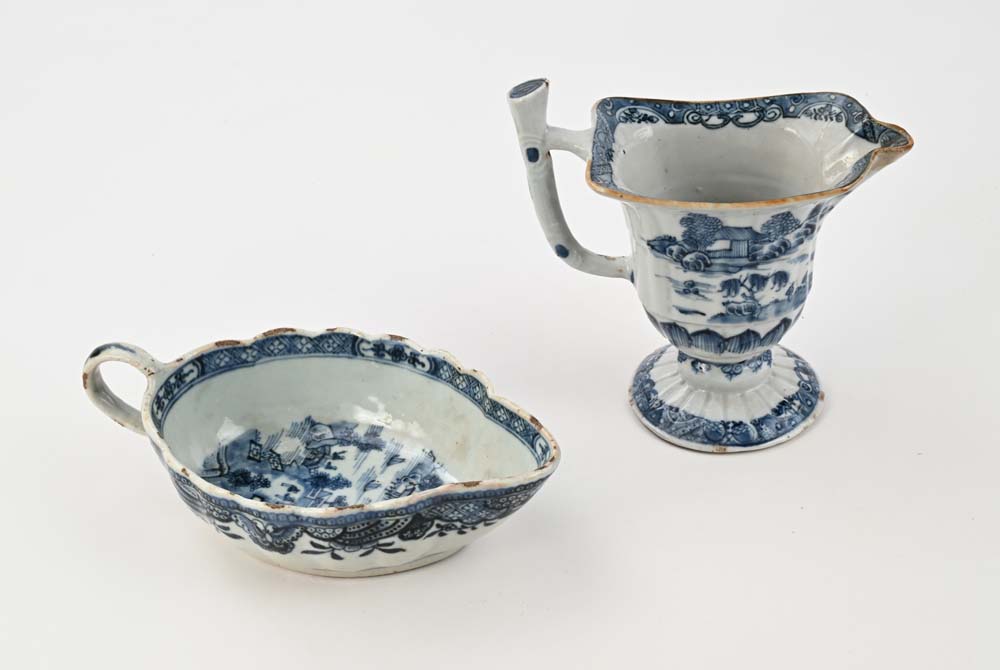 Salsiera a navicella e brocchetta in porcellana bianca e blu, Compagnia delle Indie, XVIII secolo entrambe decorate da un paesaggio con pagode; lievi difetti e piccoli restauri cm 6x19x10,5 e altezza cm 14 rispettivamente