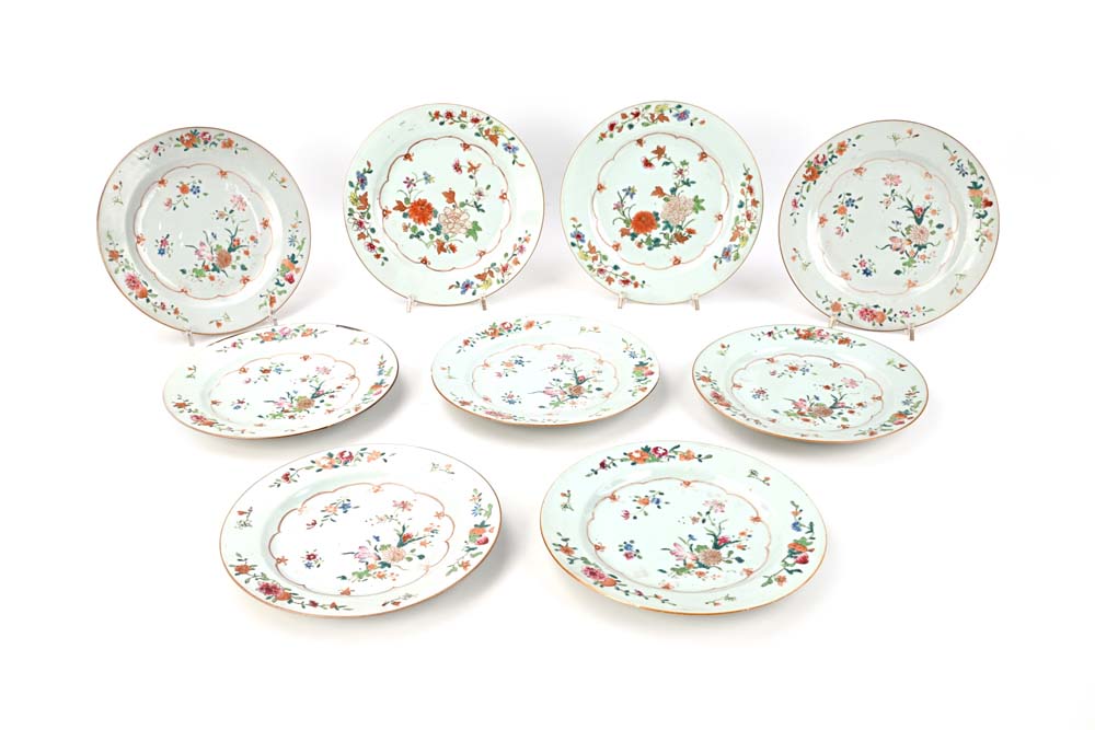 Nove piatti in porcellana policroma a motivi floreali, Compagnia delle Indie,...