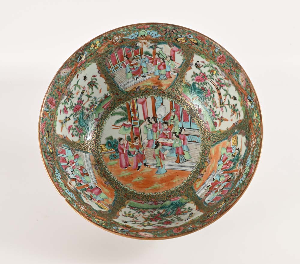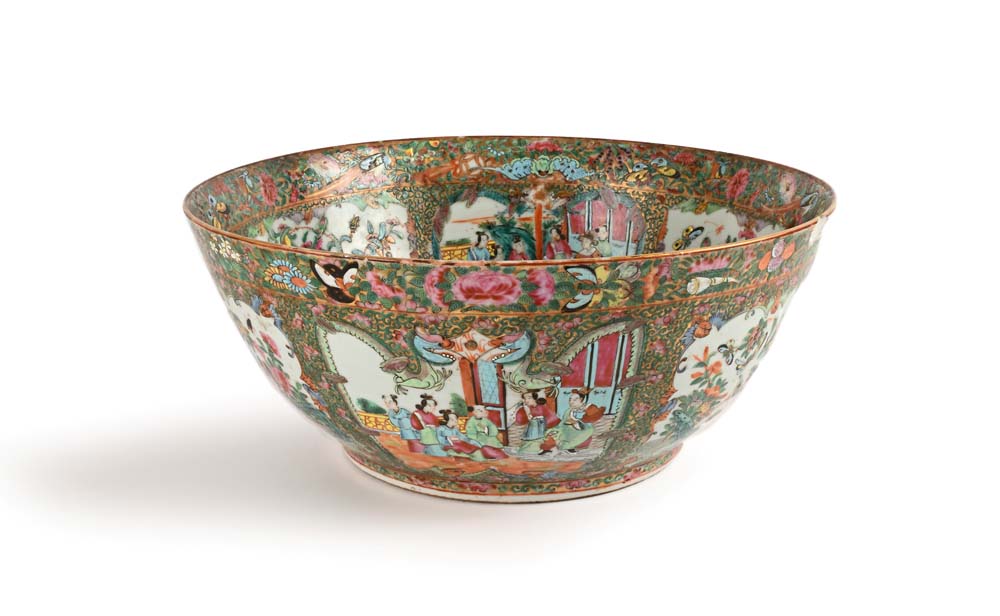 Grande ciotola in porcellana policroma, Cina, XIX secolo decorata nei toni della Famiglia Rosa con scene di genere e composizioni naturalistiche racchiuse entro riserve sagomate. Lievi difetti (una piccola sbreccatura lungo il profilo) cm 17,5x41 Famiglia Imperiali, Roma, discendenti di Paolo Camillo Thaon di Revel e di Sant'Andrea, Duca del Mare, Torino