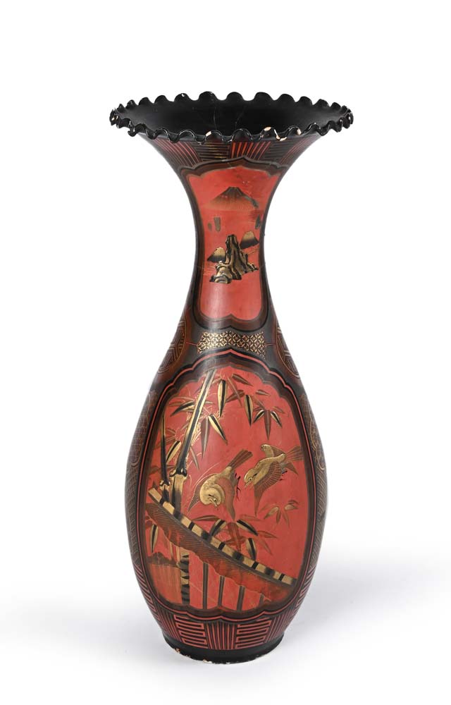 Grande vaso in porcellana rosso, nero e oro, Giappone, XIX secolo corpo ad anfora con bocca espansa ed orlo ondulato, decorazione in oro su fondo nero e riserve rosse con vegetazione palustre e figure di volatili. Difetti altezza cm 76
