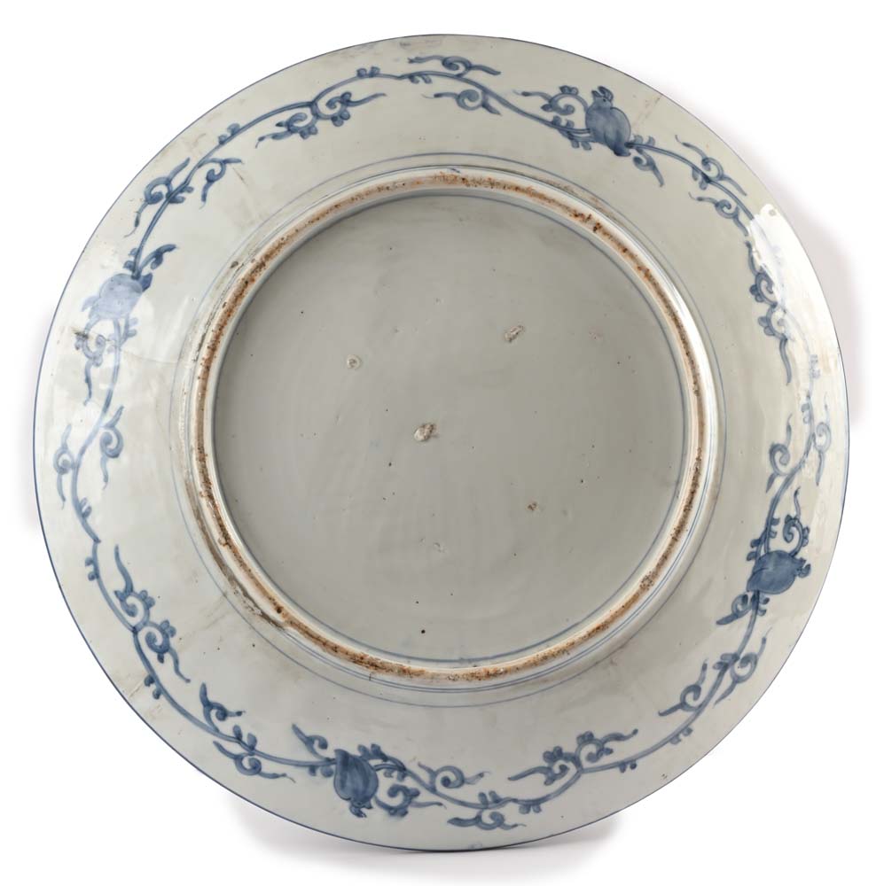 Grande piatto in porcellana di Imari, Arita, Giappone, XX secolo decorato nei toni caratteristici dell'Imari a figure di volatile e composizioni floreali entro specchiature rettangolari; orlo percorso da linea spezzata blu, tono cromatico ripreso al verso della tesa decorata da un lungo tralcio continuo diametro cm 56