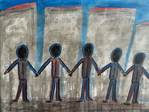 Tecnica pittorica rapida con tante velature conseguenti, per dare alcuni punti scuri e altri chiari nell'insieme, fatto di persone anonime e palazzoni di periferia.