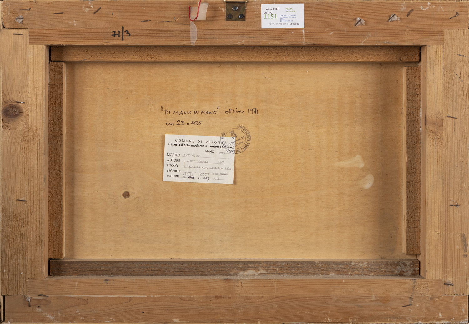 Exhibition: Verona, Galleria d'Arte Moderna e Contemporanea Palazzo Forti, 18 February 1974, Claudio Cintoli Antologica, curated by G. Cortenova (label and stamp on the back).