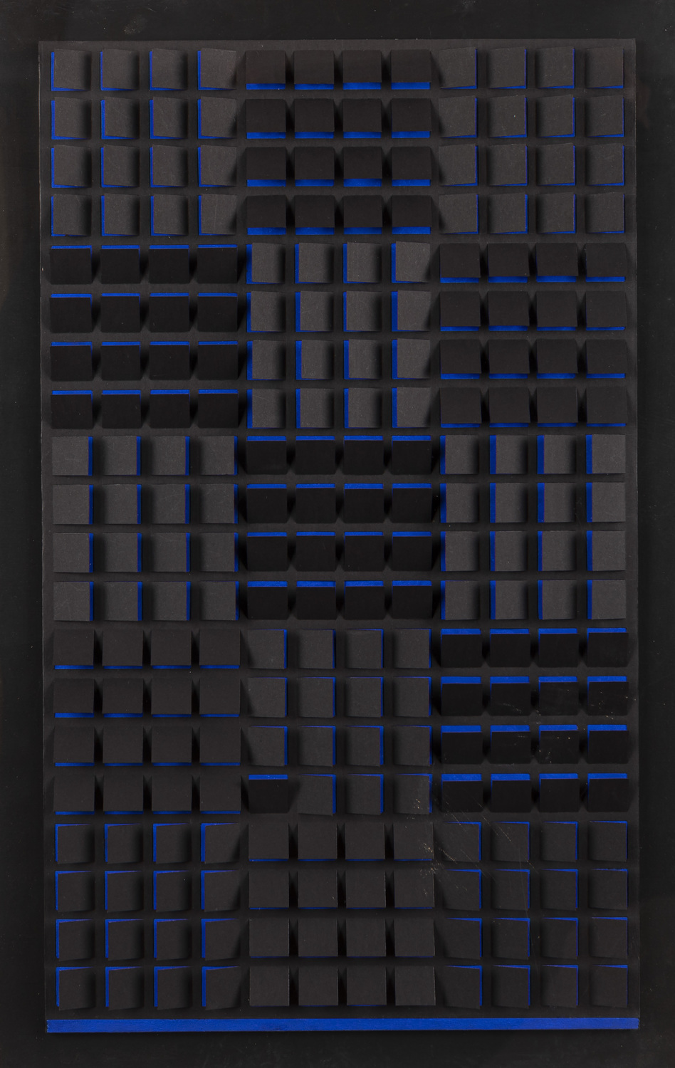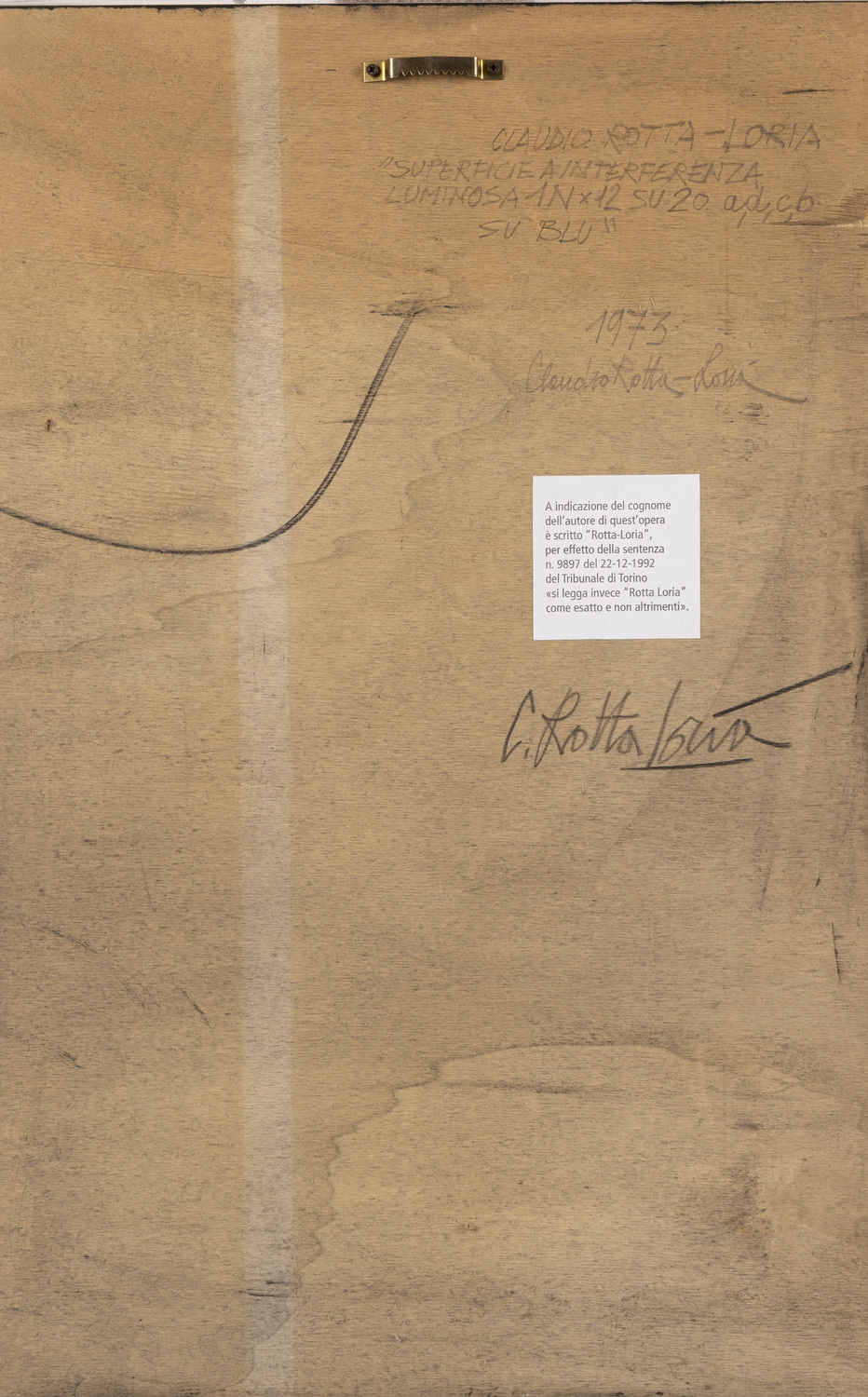Titled, dated and signed on verso: Superfice a interference luminosa 1Nx12 su 20 a,d,c,b su blu 1973 Claudio Rotta Loria