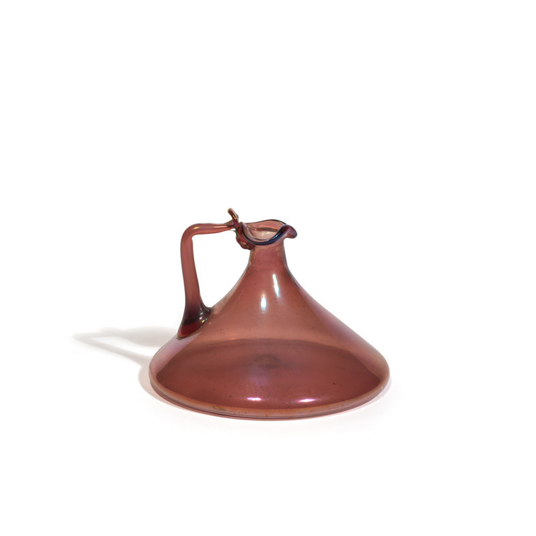 Una piccola brocca in vetro trasparente ametista con superficie leggermente iridata.