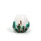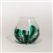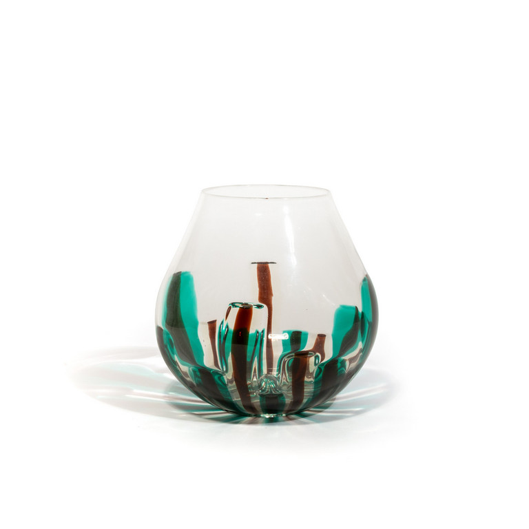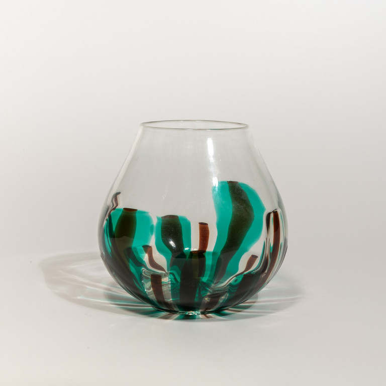 Un vaso ovale in cristallo con decoro di canne bicolore che si sviluppano dalla base.