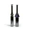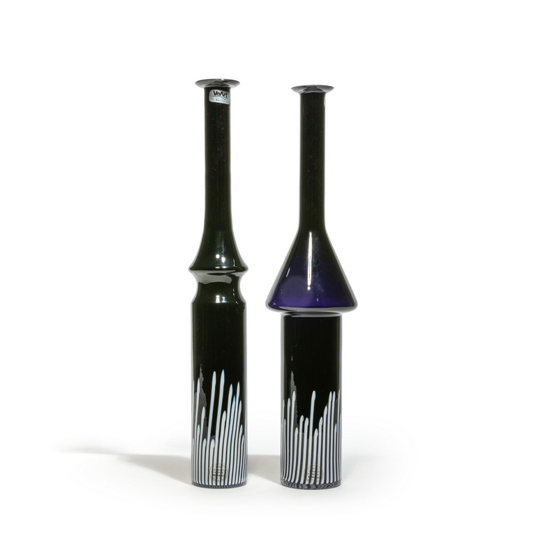 Due vasi 'Sherazade' in vetro nero e inclusioni di canne verticali bianco lattimo.
