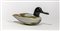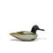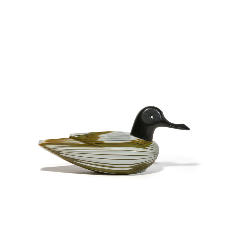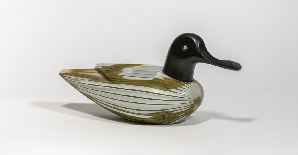 Una scultura di anatra in vetro pieno a canne colorate e testa nera lavorata alla mola.