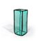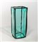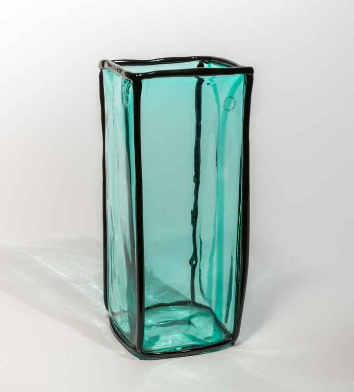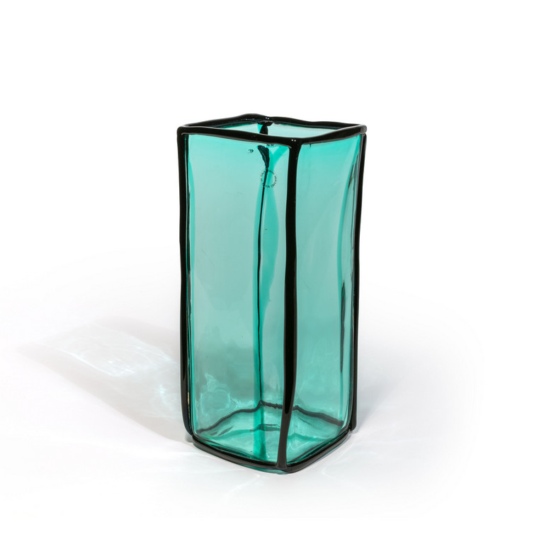 Un vaso 'Epipedos' a sezione quadrata in vetro trasparente acquamare con fasce verticali turchese base spigoli e bocca profilati in vetro nero.