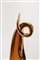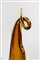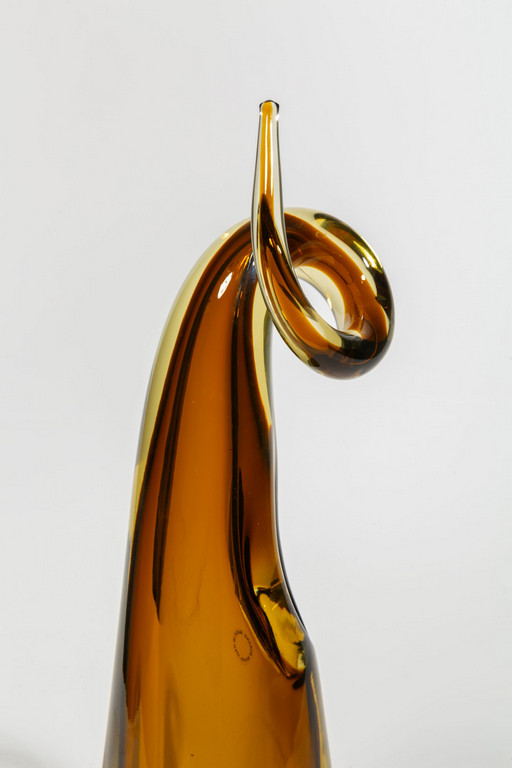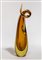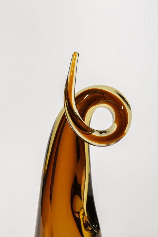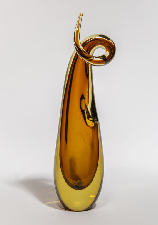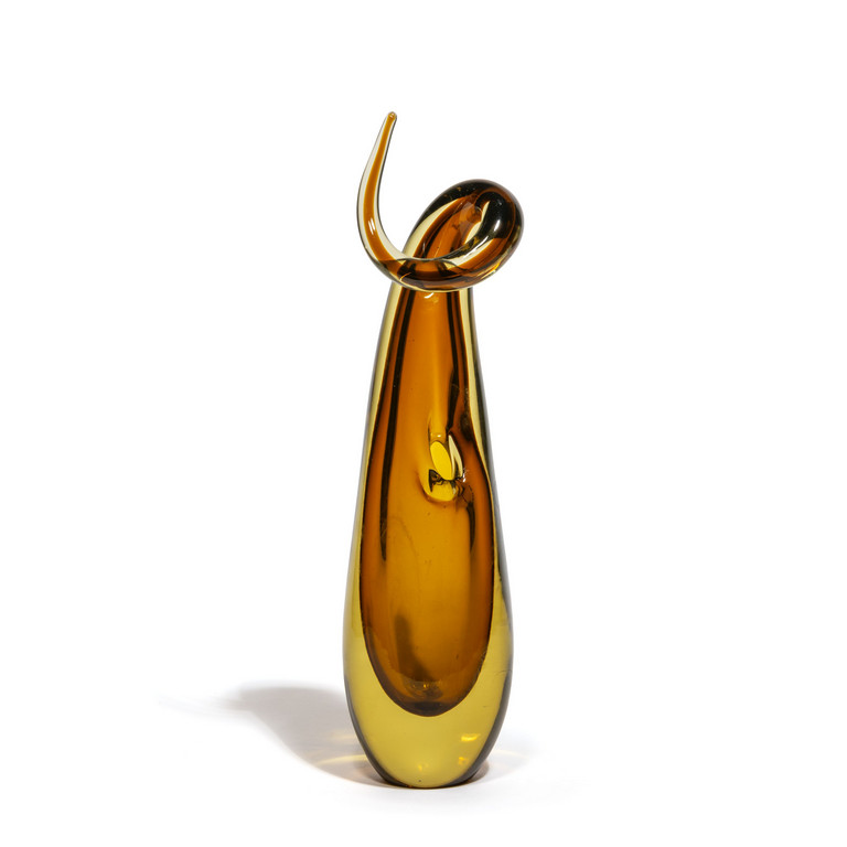 Un vaso in vetro sommerso ambra con sommità a ricciolo e bocca laterale.