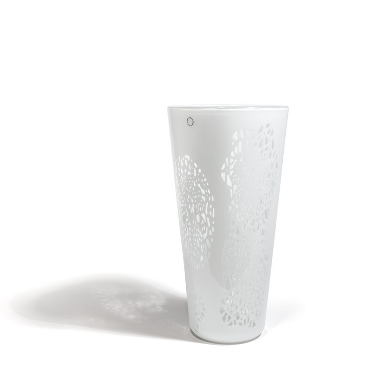 Un vaso della serie 'Merletti' in vetro lattimo con decori traforati.