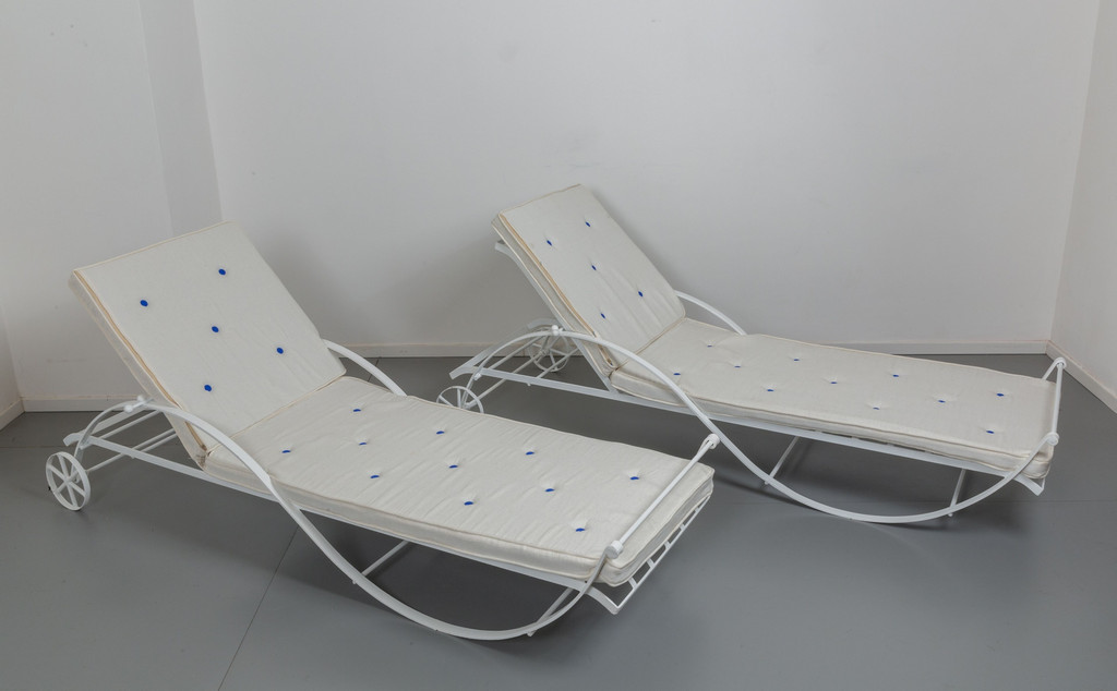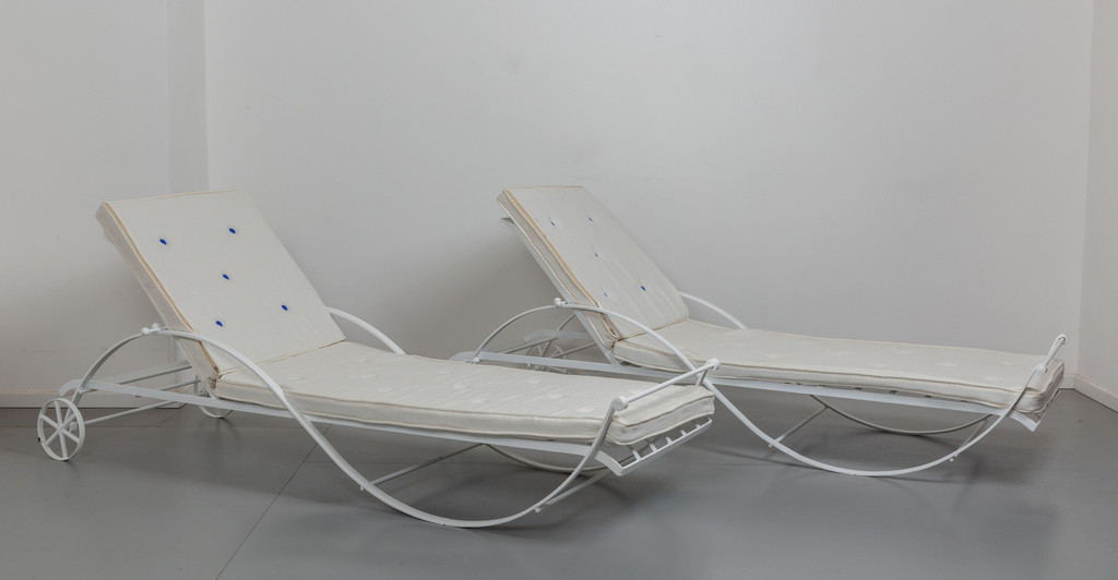 Varnished metal fabric upholstered cushions adjustable backrests.
