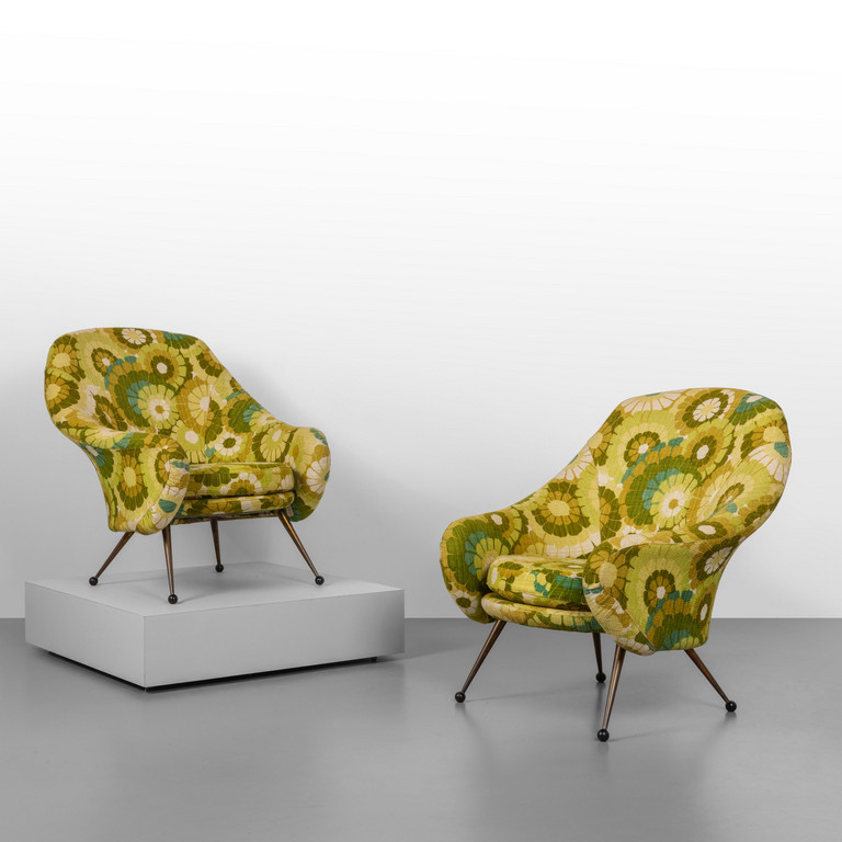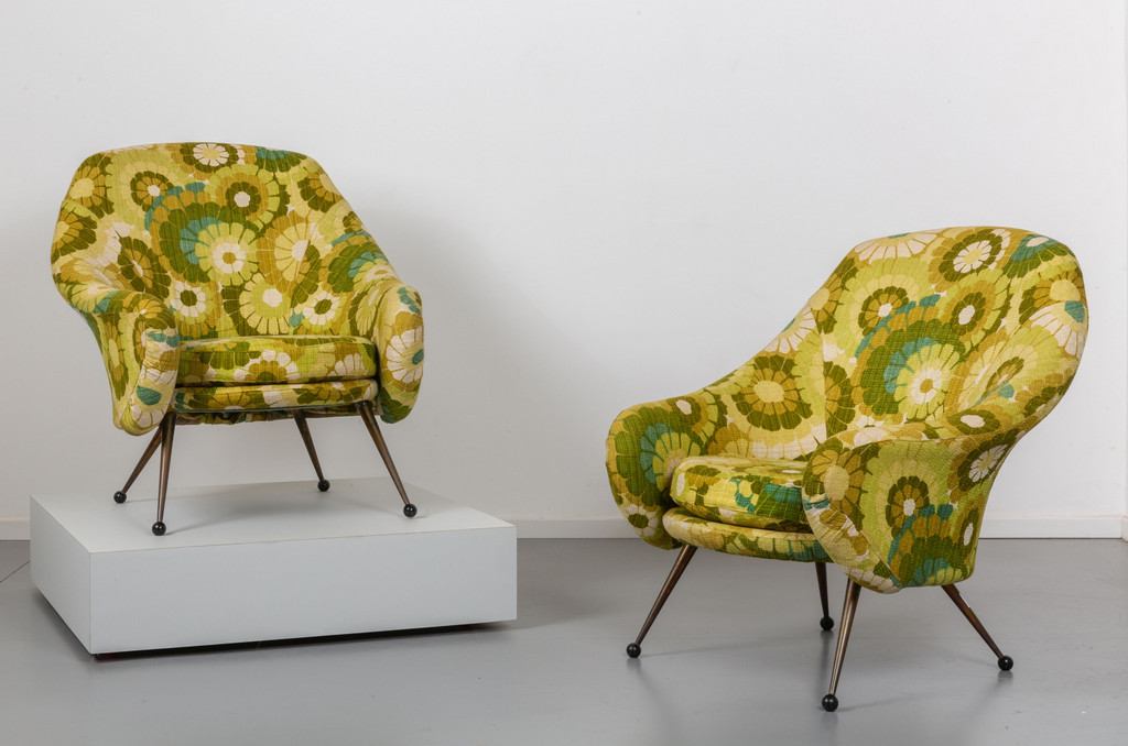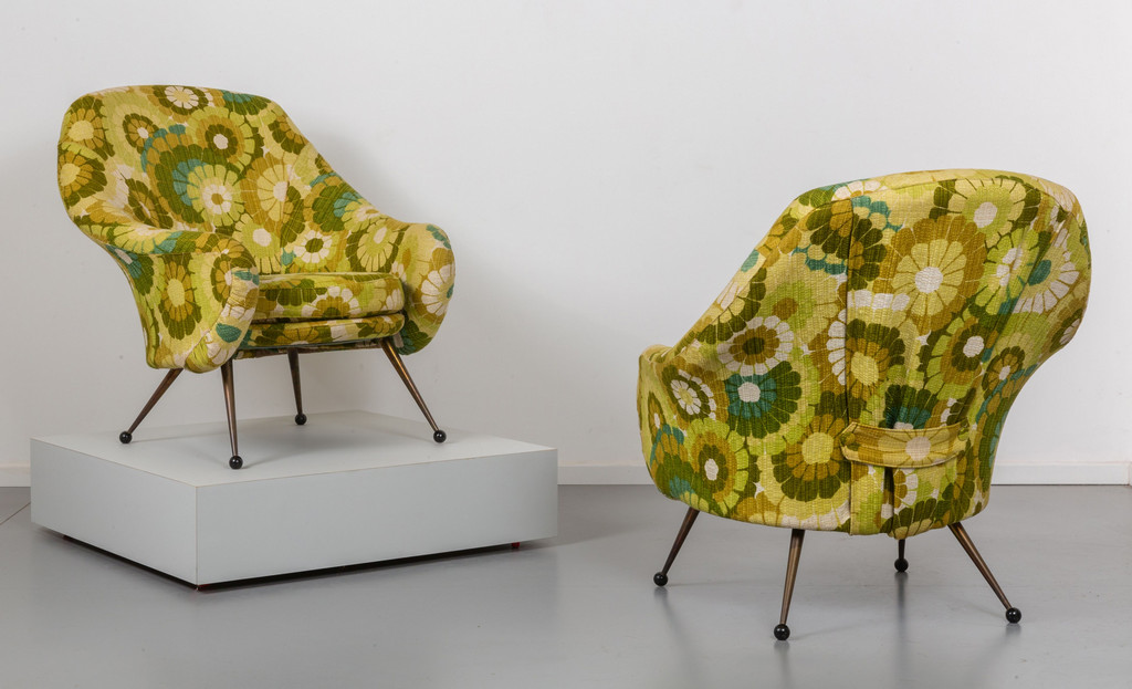 Struttura in acciaio gambe in ottone con puntali in plastica imbottiture rivestita in tessuto.