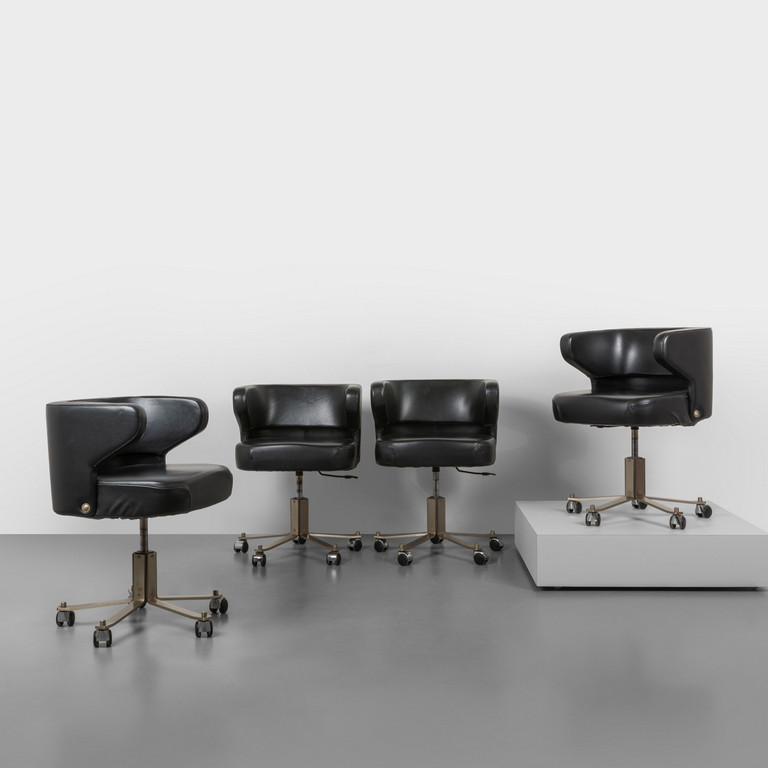 Acciaio satinato, imbottiture rivestite in vinilpelle, altezza regolabile con pistone a gas.