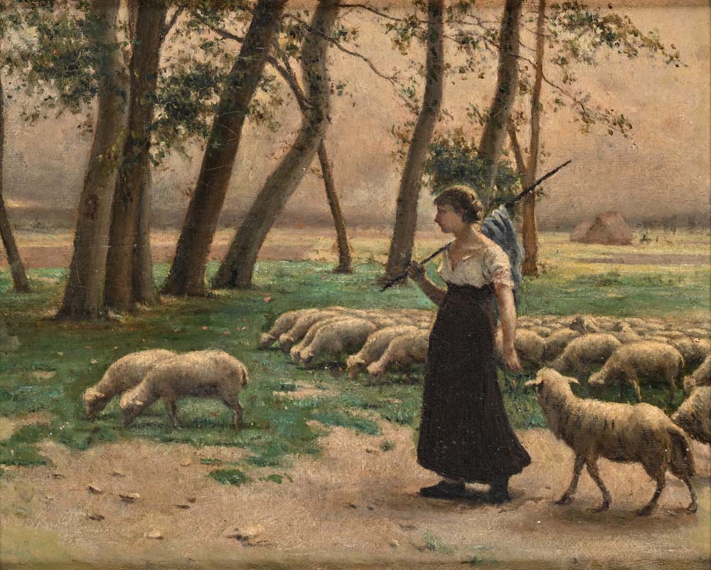 Scuola Italiana del XIX secolo Pastorella con gregge di pecore Olio su tela...