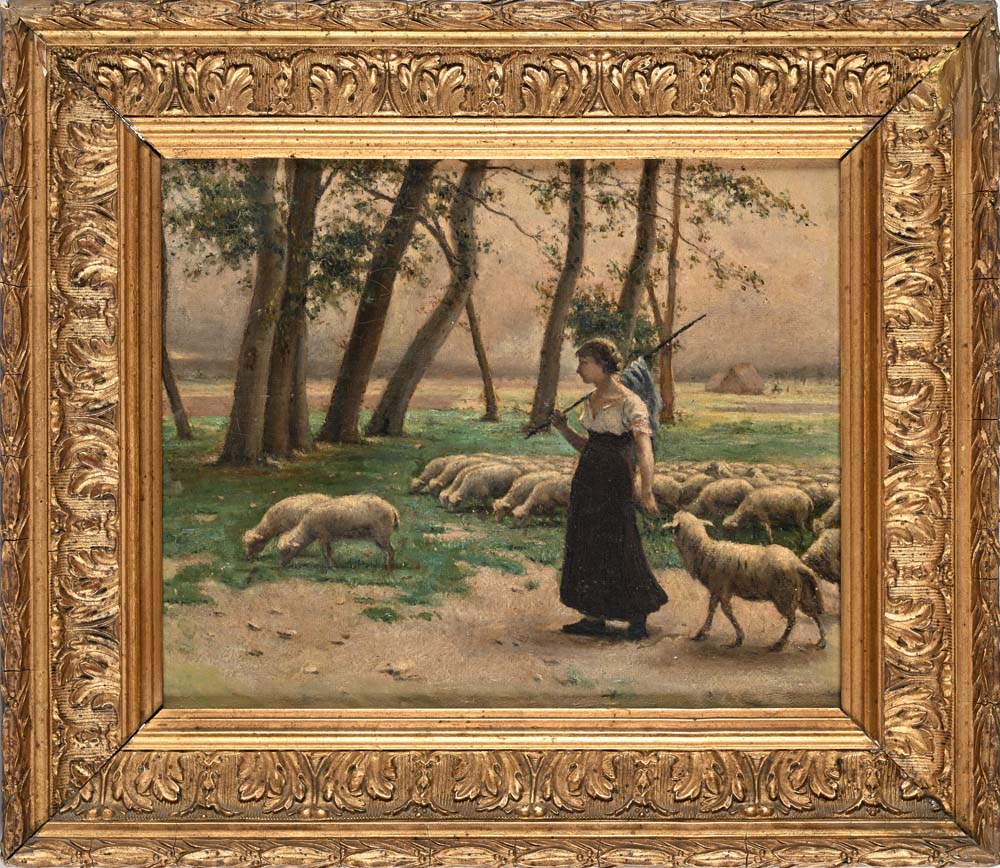 Scuola Italiana del XIX secolo Pastorella con gregge di pecore Olio su tela cm 21,5 x 27 - in cornice cm 31,5 x 36