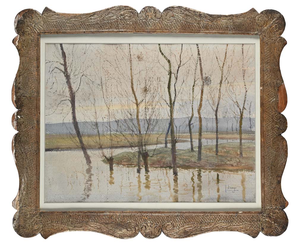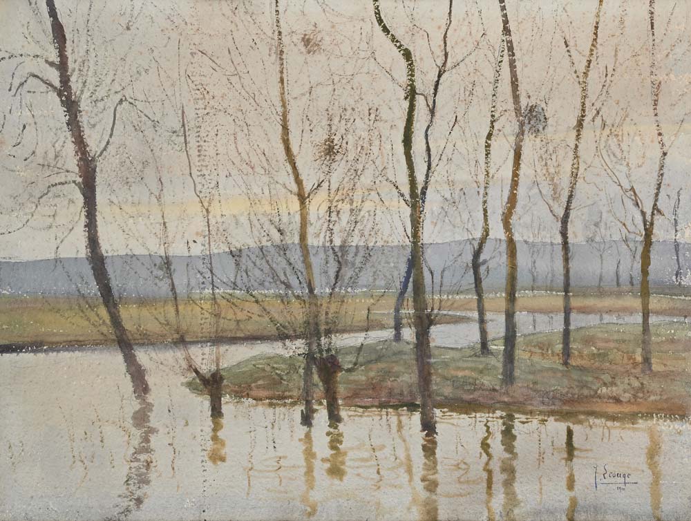 Joseph Lesage (Scuola francese inizio del XX secolo Paesaggio fluviale con alberi spogli 1910 Firmato e datato in basso a destra: 'J. Lesage / 1910'