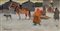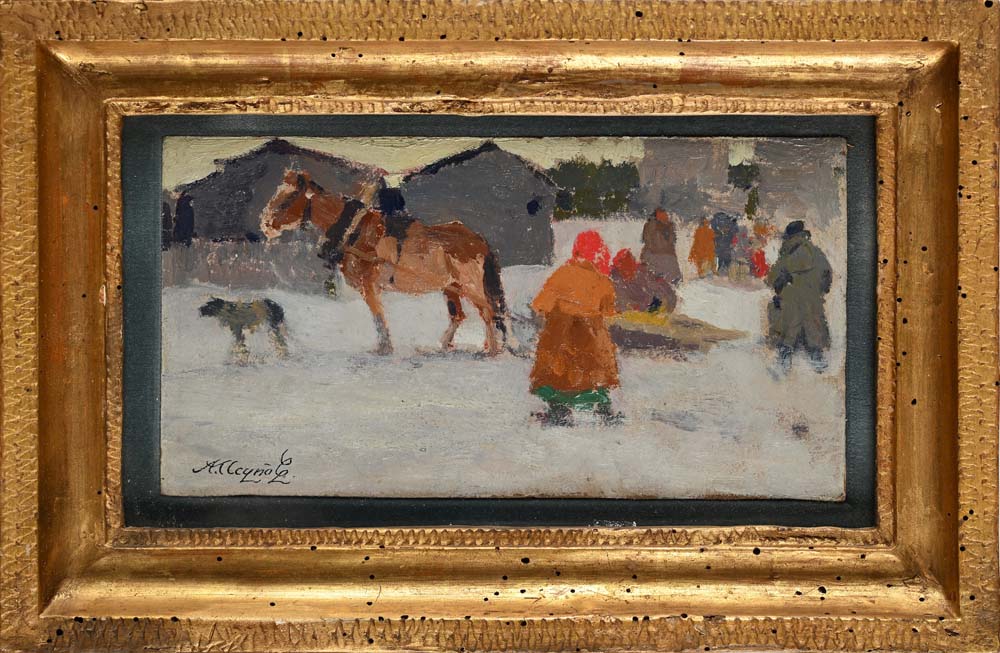 Alessio Issupoff Vjatka 1889 - Roma 1957 Scena di vita nel villaggio innevato Firmato in cirillico 'A. Issupoff.' in basso a sinistra. olio su cartone cm 11,5 x 21,5 - in cornice cm 20,5 x 31
