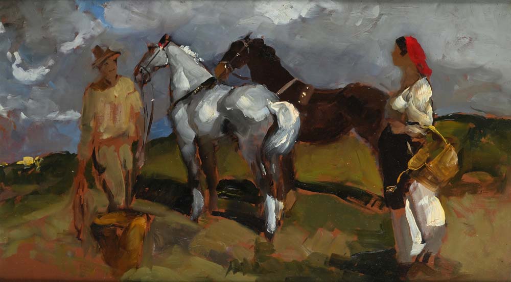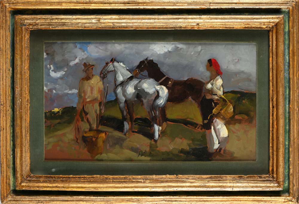 Alfredo Del Sordo Otranto 1905 - Roma 1961 coppia di contadini in sosta con due cavalli olio su masonite cm 26 x 45 - in cornice cm 43,5 x 62,5