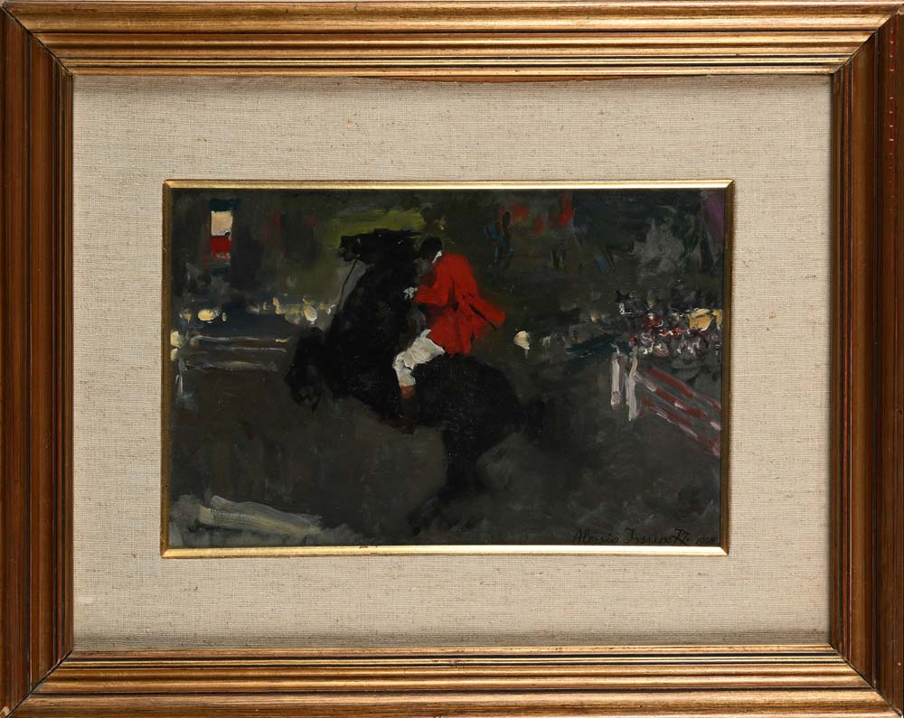 Alessio Issupoff Vjatka 1889 - Roma 1957 Cavaliere con cavallo impennato alla riunione ippica internazionale di Roma nel 1948. 1948 Firmato e datato in basso a destra: 'Alessio Issupoff. 1948' . Olio su legno cm 19,5 x 29,5 - in cornice cm 37 x 47