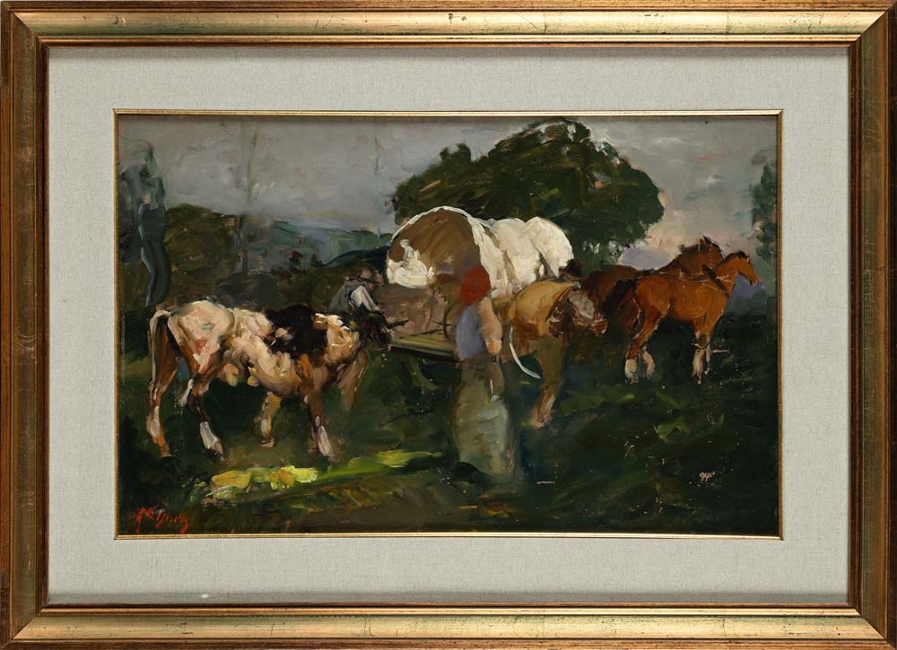Alfredo Del Sordo Otranto 1905 - Roma 1961 Carovana di contadini Firmato: 'A Del Sordo' in basso a sinistra olio su masonite cm 35 x 54,5 - in cornice cm 53 x 73,5