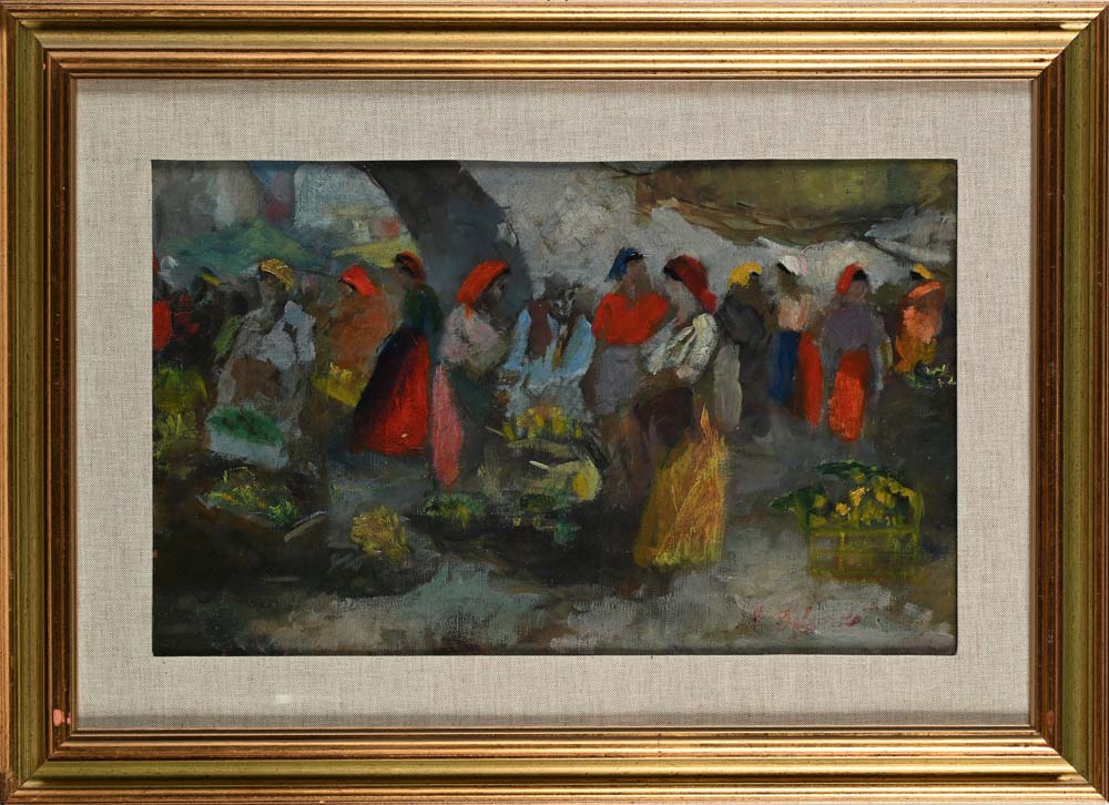 Alfredo Del Sordo Otranto 1905 - Roma 1961 Mercato di ortaggi Firmato: 'A del Sordo' in basso a destra. olio su tela cm 29,5 x 46,5 - in cornice cm 45,5 x 63