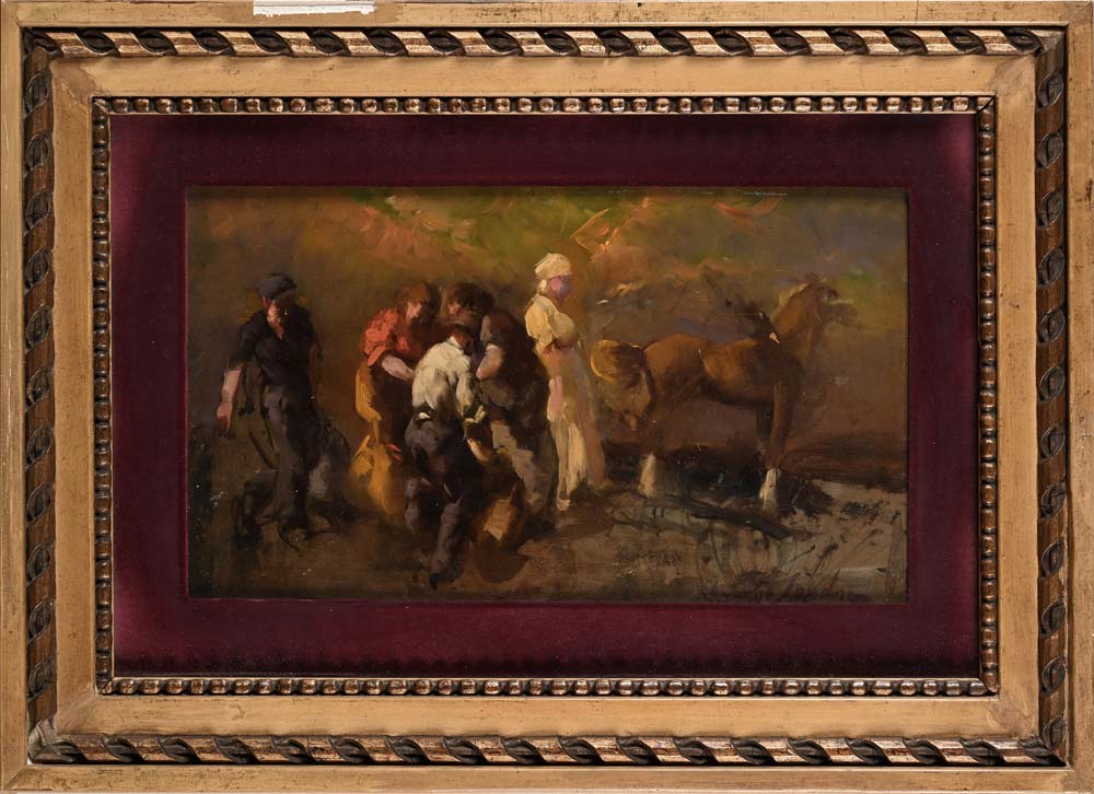 Alfredo Del Sordo Otranto 1905 - Roma 1961 Lavoro in campagna Firmato: 'A. del Sordo' in basso a destra. olio su masonite cm 19,5 x 32,5 - in cornice cm 33,5 x 46,5