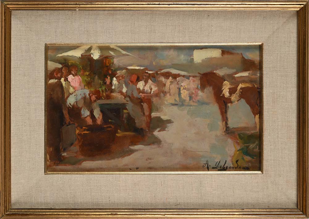 Alfredo Del Sordo Otranto 1905 - Roma 1961 Scena di vita al mercato Firmato: 'A. Del Sordo' in basso a destra. olio su masonite cm 18,5 x 30,5 - in cornice cm 31,5 x 43