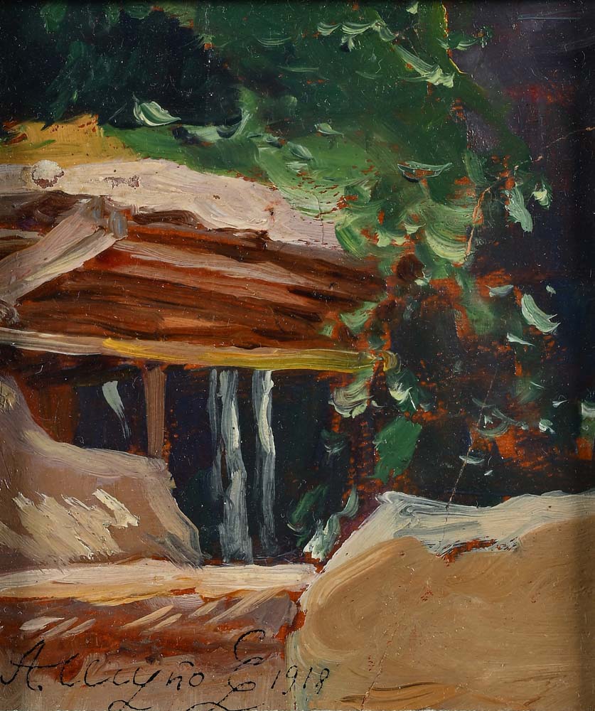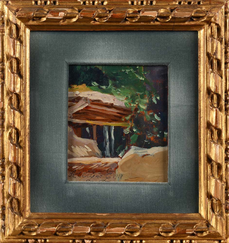 Alessio Issupoff Vjatka 1889 - Roma 1957 Una rimessa in campagna 1918 Firmato e datato in cirillico: 'A. Issupoff / 1918' in basso a sinistra. olio su tela riportata su cartone cm 11,5 x 10 - in cornice cm 23 x 22
