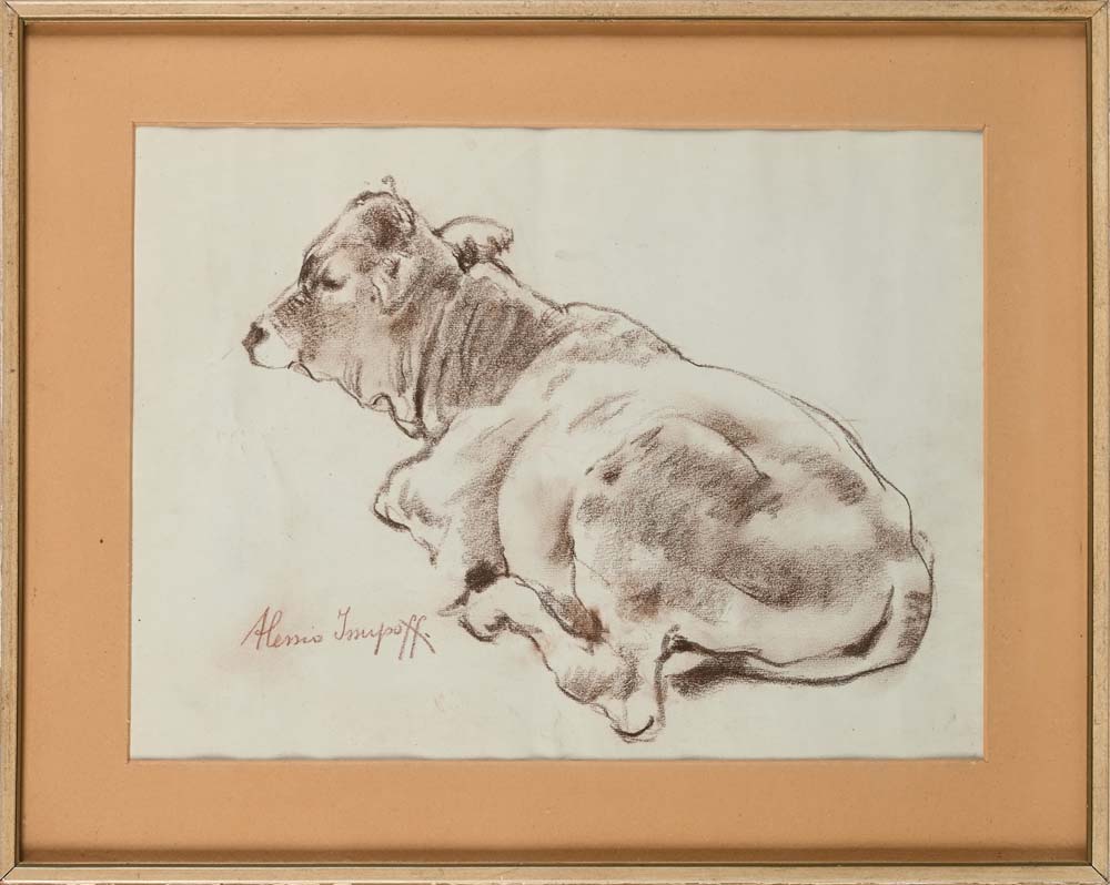 Alessio Issupoff Vjatka 1889 - Roma 1957 La mucca accovacciata Firmato 'Alessio Issupoff.' a sinistra verso il basso. pastello su cartoncino cm 29,5 x 39,5 - in cornice cm 41,5 x 51,5