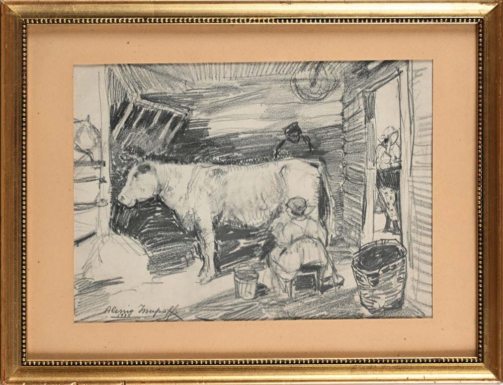 Alessio Issupoff Vjatka 1889 - Roma 1957 La mungitura nella stalla 1935 Firmato e datato in basso a sinistra: 'Alessio Issupoff / 1935'. carboncino su cartoncino cm 18,5 x 25,2 - in cornice cm 27,5 x 35,5